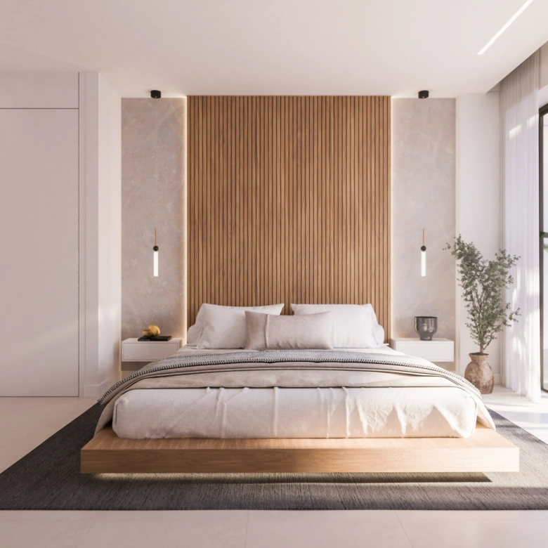 Světlé a komfortní ložnice s funkční dispozicí a kvalitními materiály.