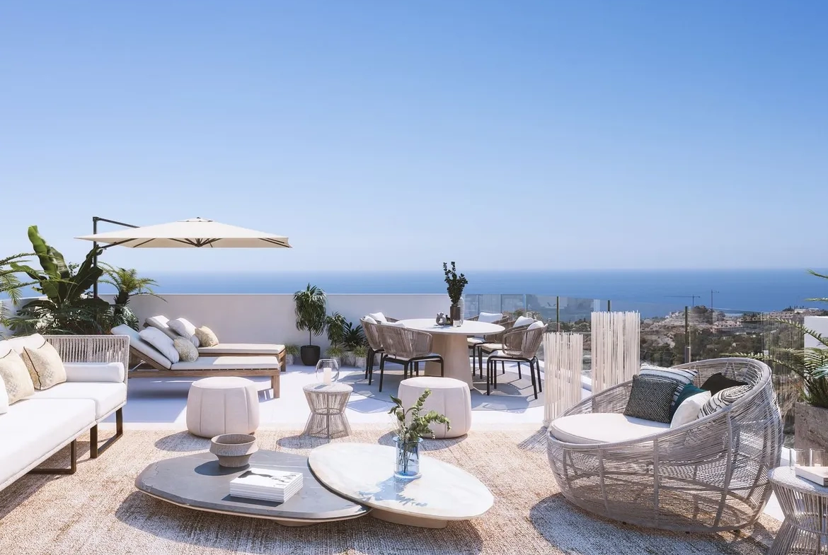 Nové moderní apartmány s WOW panoramatickými výhledy na Středozemní moře a pobřeží města Benalmádena (Malaga, Španělsko).