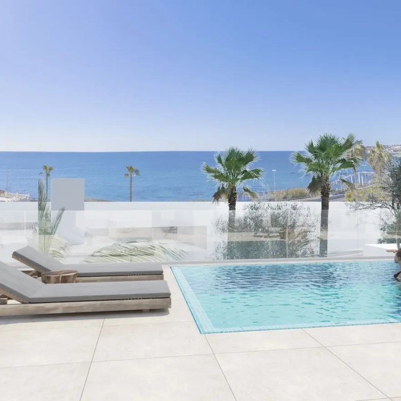 Nádherná nová moderní luxusní vila u pláže s výhledem na moře a na skok od centra a golfu v Mijas Costa (Malaga, Španělsko).