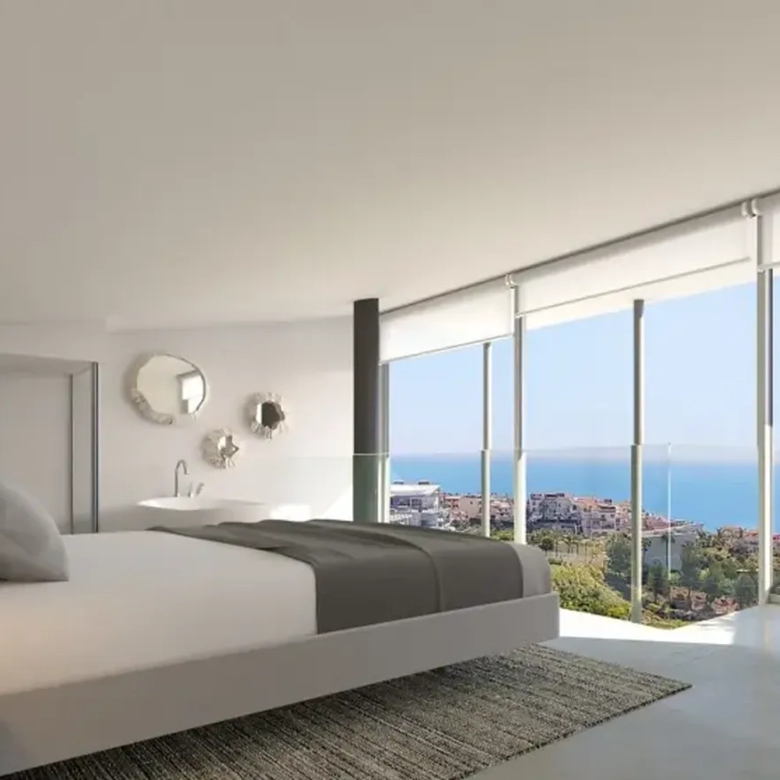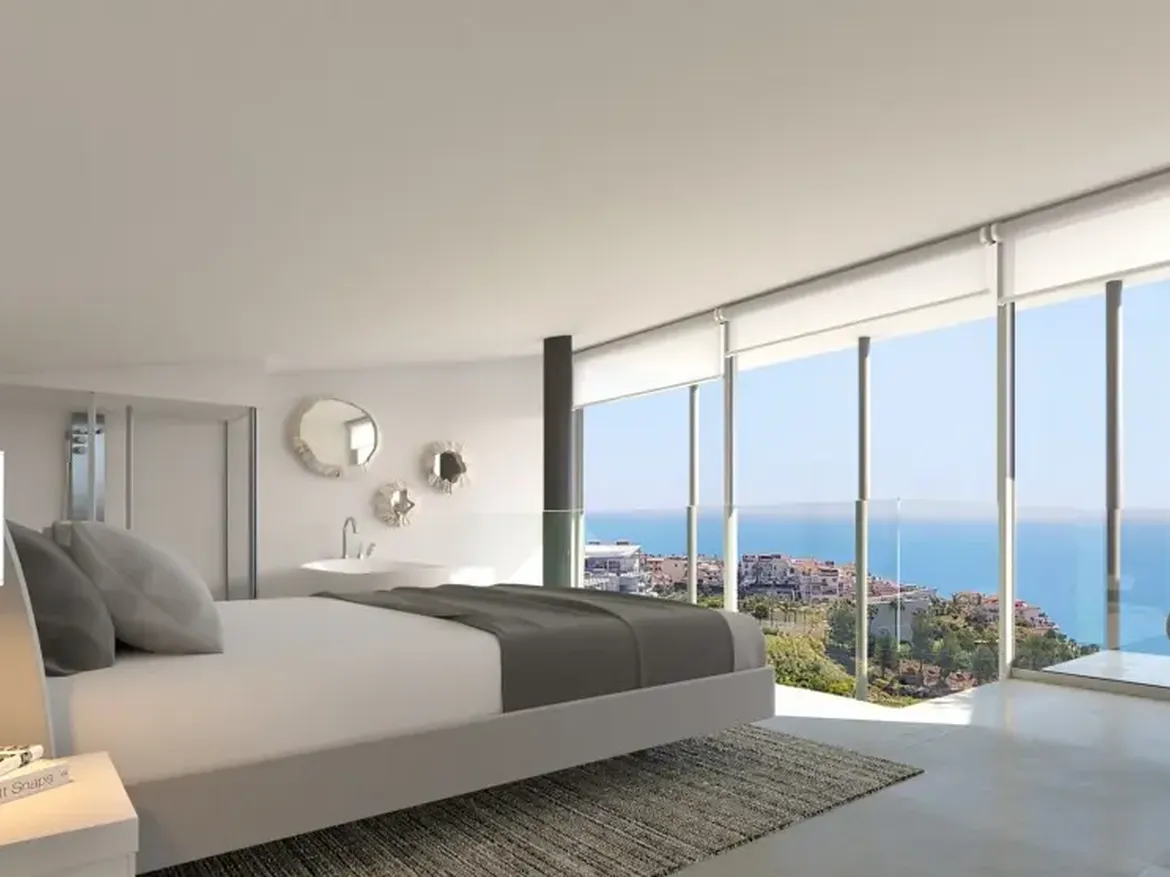 Exkluzivní luxusní vily s jedinečným designem a jedinečným panoramatickým výhledem na moře v Benalmadena Costa (Malaga, Španělsko).